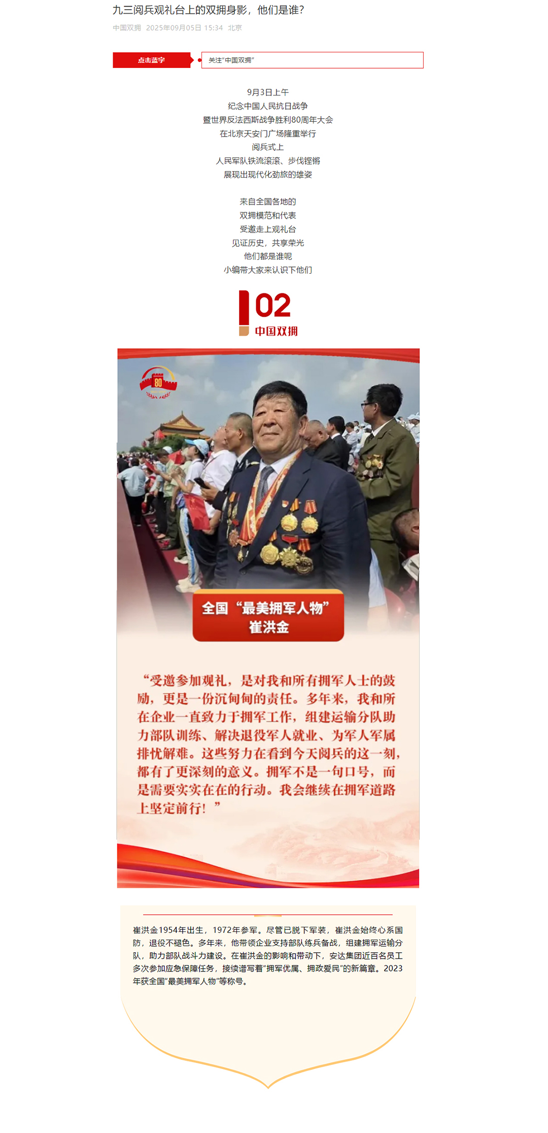 崔洪金参加9.3阅兵荣登《中国双拥》杂志